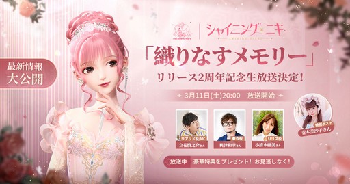 スマホアプリ「シャイニングニキ」(iOS / Android)の2周年を記念した「シャイニングニキ『織りなすメモリー』2周年記念公式生放送」が3月11日に配信される。番組では,MCに立花慎之介さん,ゲストに興津和幸さん,小清水亜美さんを迎え,本作のアップデートや記念キャンペーンに関する情報が公開されるとのこと。さらにスペシャルゲストとしてロリータ協会会長の青木美沙子さんが出演し,ファッションに対する悩みや質問に回答する「青木美沙子さんのコーデ教室」が実施される。なお,悩みや質問の募集はすでに締め切られている。