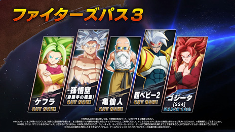 「ファイターズパック15:ケフラ」、「ファイターズパック16:孫悟空(身勝手の極意)」、「ファイターズパック17:亀仙人」、「ファイターズパック18:スーパーベビー2」、「ファイターズパック19:ゴジータ(超サイヤ人4)」を含む「ファイターズパック15〜19」が全てセットになり、お求めやすい価格になった「ファイターズパス3」もPlayStation Store、Microsoft Store、ニンテンドーeショップにて配信中です。
