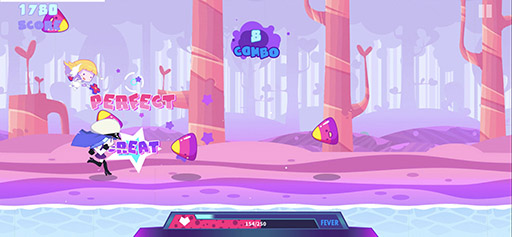そして非常にユニークなのが,プレイフィールこそリズムアクションというジャンルのそれであるものの,ビジュアル面では2D横スクロールアクションゲームっぽさを強く押し出している点。プレイヤーがリズムに合わせてゲームを進めていくことで,操作しているキャラクターが敵を次々と倒していく気持ち良さを味わえるのだ。