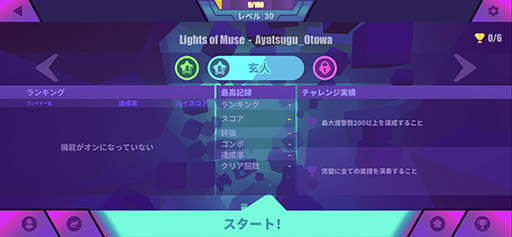 楽曲は,プレイヤーレベルによる解禁制で,プレイしていくたびに新しい楽曲に挑戦できるようなデザインだ。楽曲ごとの難度は「普通」「玄人」「達人」の3段階で,最も難しい「達人」は,その楽曲の「玄人」を一定評価以上でクリアすると解禁されるようだ。
