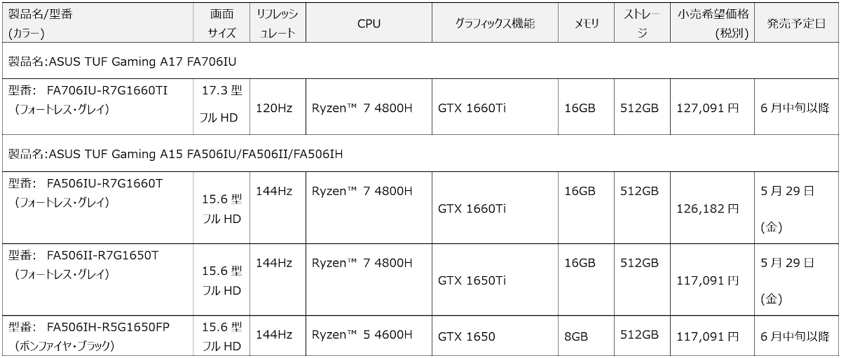 ASUS「TUF Gaming」からノートPC向けRyzen 4000搭載のゲームノートPC計4製品6モデルが登場