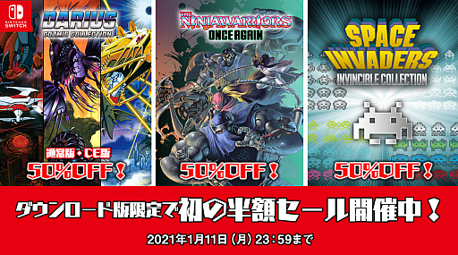 このセールでは,Nintendo Switch用の「ダライアス コズミックコレクション」「ダライアス コズミックコレクション コンシューマーエディション」「スペースインベーダー インヴィンシブルコレクション」「ザ・ニンジャウォーリアーズ ワンスアゲイン」が50%オフで販売されている。