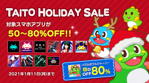 株式会社タイトー(本社:東京都新宿区、以下タイトー)は、日本国内向けに本日12月17日(木)より2021年1月11日(月)まで、Nintendo Switch用ダウンロードソフトおよびスマートフォン向けアプリとして配信中の各種ゲームタイトルが、50〜80%OFFとなるタイトーホリデーセール2020を実施します。