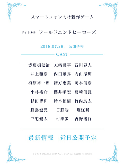 スクエニ,新作アプリ「ワールドエンドヒーローズ」を発表。井上和彦さんや櫻井孝宏さんら21名の声優が参加