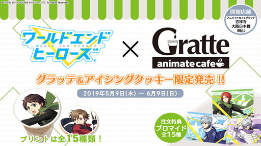 株式会社スクウェア・エニックス(本社:東京都新宿区、代表取締役社長:松田洋祐、以下スクウェア・エニックス)は、シチュエーションスタイルRPG『ワールドエンドヒーローズ』において、2019年5月9日(木)より、株式会社アニメイトカフェ(本社:東京都板橋区、代表取締役:藤田朋洋、以下アニメイトカフェ)が運営・販売しておりますグラフィックラテ、『Gratte(グラッテ)』とのコラボレーションの開催を決定したことをお知らせいたします。