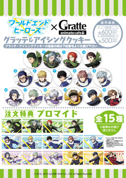 今回のコラボでは、『ワールドエンドヒーローズ』に登場する15名のヒーローのイラストをプリントしたGratte(グラッテ)15種に加え、同じイラストをプリントした「アイシングクッキー」も販売。