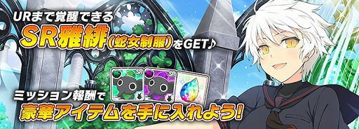 コラボイベント「我が儚き栄光よ」をクリアすると、確率で「SR雅緋(蛇女制服)」がドロップ!「雅緋」は、URまで覚醒させることができ、同時開催のタワーイベント「招き蕩う黄金劇場」「水天日光天照八野鎮石」で手に入る「共闘メダル」で閃乱覚醒させると、「シャルルマーニュ」の衣装に変化します!