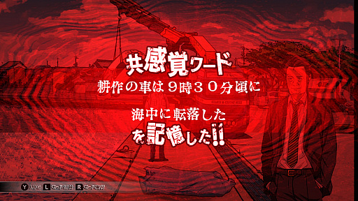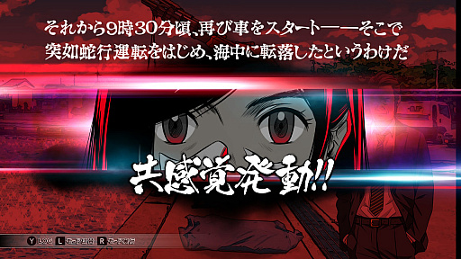 「共感覚」は,他人との会話の中から忘れてはいけないキーワードを視覚化するもので,自身の深層意識が必要と判断した言葉が自動的に記憶されていく。蓄積された言葉は,後述するマックスモードで使用するのだが,プレイヤーが殺人のトリックを解くための大きなヒントにもなる。