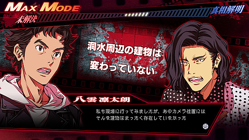 またマックスモードは解決編で容疑者を追及するときはもちろん,各チャプターで重要な何かを隠している登場人物から証拠や証言を得るときにも発生する。