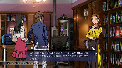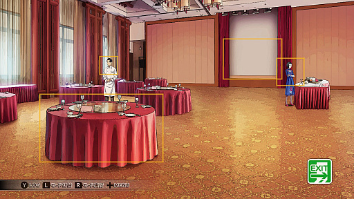 ![]() 調べられる箇所や話しかけられる人物は,カメラの顔検出機能のように四角い枠で表示される。こちらも本作の洗練された印象を強めるのに一役買っている |