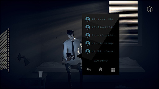 一人っきりの部屋、大企業への出社、アプリの広告、母からのメッセージ、積み上げられた請求書。