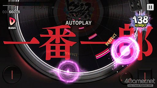 楽曲プレイ中は,ターンテーブルのような画面に流れてくるノーツ(タップするもの)を指で捉えていきます。
