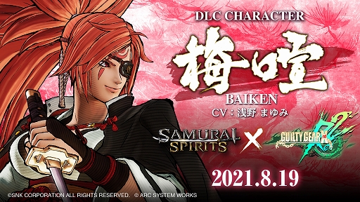 株式会社SNK (本社:大阪府吹田市、CEO:松原 健二)は、剣戟対戦格闘ゲーム『SAMURAI SPIRITS』のシーズンパス3のDLCキャラクター第4弾として、アークシステムワークス株式会社の対戦格闘ゲーム『GUILTY GEAR Xrd REV 2』で人気が高い女剣士「梅喧」(読み:バイケン)を2021年8月19日より配信することをお知らせいたします。