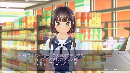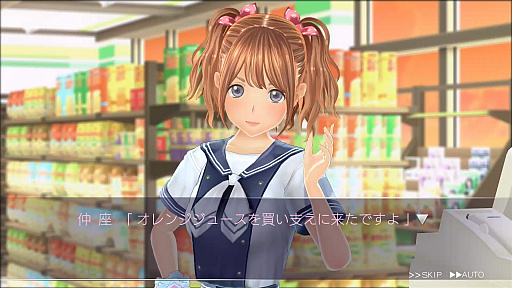 バイト先は,学校からちょっと離れたところにあるコンビニで,ここでがんばって働き,貯めたお金を下校デート代として使えるほか,コンビニに女の子がやってきてイベントが発生することもあるという。掲載したスクリーンショットは,幼なじみの日向寺南夏と,学園アイドルの仲座ろみがお店に現れた場面だ。