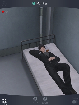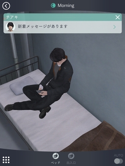 続いて,「監視」について紹介しよう。チアキがいる保護室には,いくつかの監視カメラが設置されている。プレイヤーに支給される「SABOT」と呼ばれる携帯端末で「監視」を選び,画面下の「ベッド」または「出入り口」をタップするとカメラが切り替わるのだが,今作の新しい要素として,画面を左右にスワイプすることで,カメラの向きを動かせるようになった。