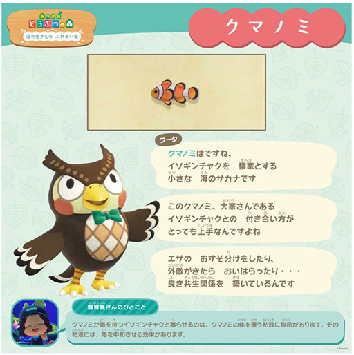 ゲーム内でサカナや海の幸を博物館に寄贈した際などに聞けるフータの解説コメントや,飼育員さんによる豆知識が楽しめる,オリジナル解説パネルが各水槽に設置されるほか,フォトスポットとしてキャラクターパネルが館内各所に設置される。