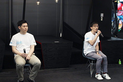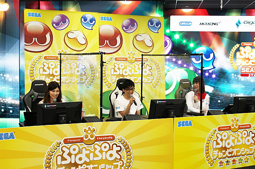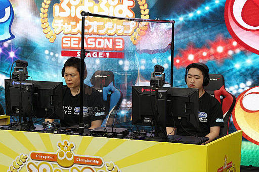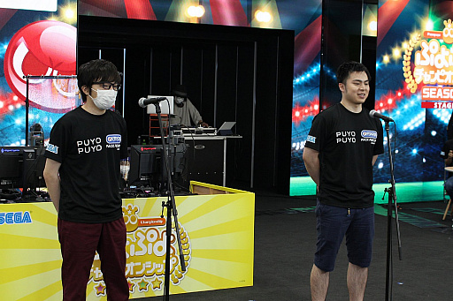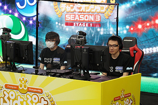 ![]() 今回ゲスト解説者として,ぷよぷよの名プレイヤーmomoken氏(左)とえちご氏(右)が登場した |
