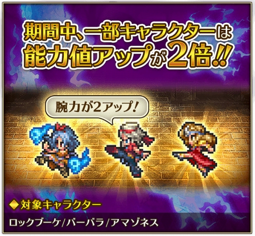 また、対象キャラクターを連れて特定のクエストに出撃することで、バトル後の能力値アップが2倍になるキャンペーンも開催いたします。