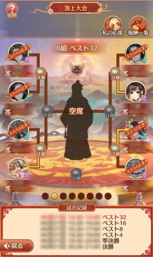大会は準備段階、ベスト32、ベスト16、ベスト8、ベスト4、準決勝、決勝戦に分かれていますが、大会開催時に入選した選手をランダムに組分けします。また、出陣キャラは試合開始時のパーティーに準じますので、試合開始前にパーティーを整えることを推奨します。そして、試合時間になると自動的に戦闘に参加します。