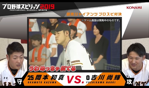 動画では,3イニング1マッチの試合をプレイ。オーダーの変更中に自身の見た目やチームメイトの能力に対する要望が止まらない岡本選手や,リアルな表現に「似ている」を連呼する吉川選手など,2人の選手がゲームを楽しむ姿が見られる。