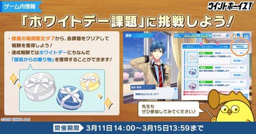 3月11日(土)から、ホワイトデーにちなんだ期間限定課題が開催中です。課題をクリアして、「部員からの贈り物」を受け取ってくださいね。