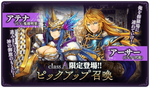 ダクリベリリースを記念し、期間限定「ピックアップ召喚」を開催いたします。「ピックアップ召喚」では、classA「アテナ(CV:鬼頭明里)」及びclassA「アーサー(CV:八代 拓)」が登場。
