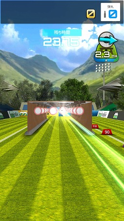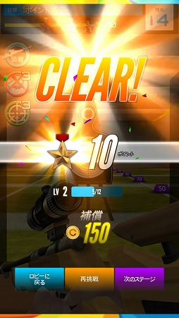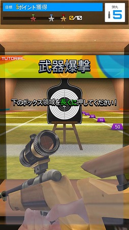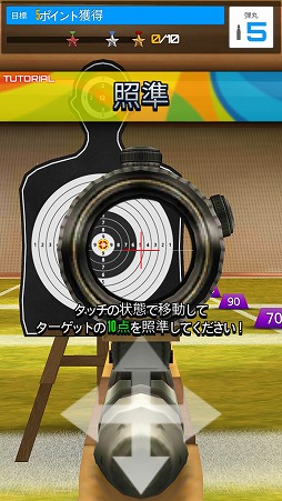 画面の下部をホールドすると銃を構え,そこから指を離すと弾丸を発射する。着弾点に応じて獲得したスコアが規定値に達するとステージクリアだ。