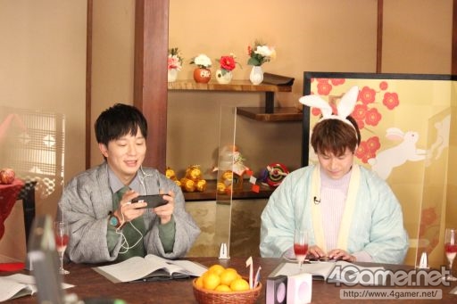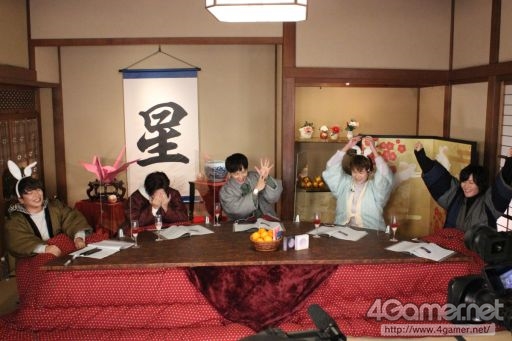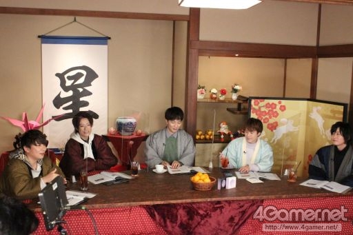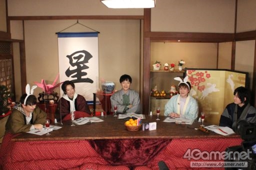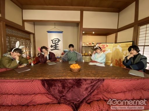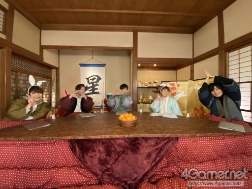 今回の配信は,某所にある日本家屋から行われた。部屋の中央にあるこたつは,キャスト5人が入っても,まだ広々とした大きさ。衣装の半纏も冬らしく,かなり冷え込む時間帯であったものの,キャストの醸し出すあたたかい空気に包まれた放送となった。ちなみに今回は,高坂さん以外の4人が年越し配信に初登場とのことだ。