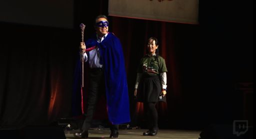 基調講演も終わろうとしていたそのとき,「待った待った待った」と聞き覚えのある声が……。ステージには,青いマントとマスクをつけたスクウェア・エニックス代表取締役社長の松田洋祐氏が現れ,新ジョブ「青魔道士」がパッチ4.5で実装されることが発表となった(関連記事)。