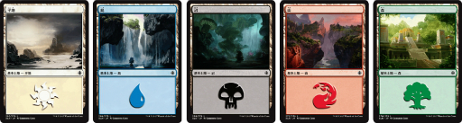 土地は5種類あり,カードと同じ色(属性)のマナが生み出される。例えば,上の画像にある平地からは白マナが,島からは青マナが生み出されるといった感じだ。色は「白」「青」「黒」「赤」「緑」があり,カードを使用するには,必要コストの属性とマナの属性が合っていなければならない。