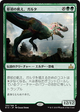 そして,このデッキには「ギガントサウルス」や「原初の飢え,ガルタ」といったパワフルなクルーチャーも入っている。これらに対抗できるスタッツを持つクリーチャーはそう多くはないので,これらを盤面に出し,パワーで押し潰してしまおうというわけだ。