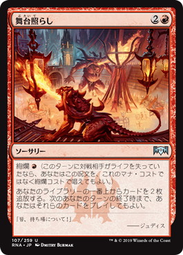 また,このデッキには“絢爛”というギミックが入っており,一部のカードは相手プレイヤーにダメージを与えておくことで,通常のコストの代わりに“絢爛コスト”を支払うことで使用できる。「舞台照らし」や「批判家刺殺」といったカードがそれに該当し,本来は使うのに赤1マナと無色2マナが必要だが,絢爛の条件を満たしていれば,絢爛コストとして赤マナ1を支払えば使えるわけだ。