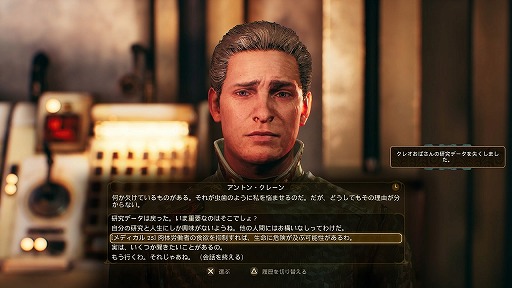 特に会話では特性やスキルによってアンロックされる選択肢が非常に多く,知覚やエンジニアリングの知識で機械の不具合を見抜いたり,医療の知識があれば治療や診断で恩を売る,といったシチュエーションも珍しくない。魅力やトーク力で報酬を上乗せする……という定番の展開ももちろん多いが,それ以外にも色々な能力が思わぬ機会で役立つことがあり,戦闘能力以外のスキルを上げる楽しみも多いのが嬉しいところ。