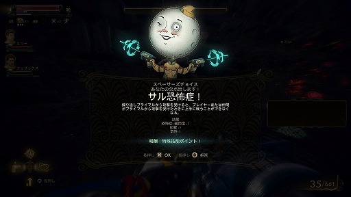 能力の強化はレベルアップ時に付与されるポイントを使うのだが,たまにイベントや戦闘中の立ち回りなどで,何かを犠牲にして特殊技能を得られる機会がある。これはサルへの恐怖症や,(頭にダメージを受けすぎたことによる)慢性的な脳震とうなど,ユニークなものが多い。