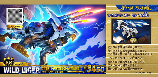 第1弾のカードは、TVアニメ「ゾイドワイルド」の主人公機「ワイルドライガー」をはじめ、ファンに人気の帝国四天王機などのゾイドが登場予定で、配出されるカードは「ワイルドレア(WR)」「スーパーレア(SR)」「レア(R)」「ノーマル(N)」「シークレットレア(SC)」の5つのレアリティのゾイドカードと、「バトル支援カード」など60種類以上をラインアップしています。「シークレットレア」は「ゾイド」の生みの親の一人、徳山光俊氏が手掛けた本筐体限定デザインのコンセプトアートを使用しています。