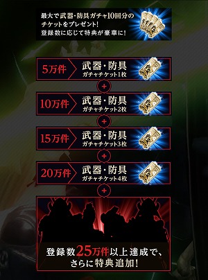特典内容は合計登録者数に応じてグレードアップし、20万人達成時には、「武器・防具ガチャチケット」を合計10枚プレゼントいたします。また、25万人を達成した際のスペシャルな特典もご用意しました。ぜひご登録ください!