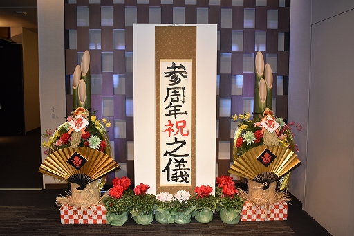 「春の海」の琴の生演奏とともに,河西さん(三日月・オーガス役),細谷さん(オルガ・イツカ役),梅原さん(ユージン・セブンスターク役)が,壇上にたすき掛けの和装で登場。琴の音が響く中,大きな筆で「鉄」「華」「団」の文字を交代でしたためると,息を合わせて「鉄華団参上!」と掛け声をあげた。