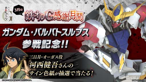 また、「ガンダム・バルバトスルプス」の実装を記念し、三日月・オーガス役 河西健吾さんのサイン入り色紙が抽選で1名様に当たるプレゼントキャンペーンを実施中です。詳細はアプリ内のお知らせや「機動戦士ガンダム 鉄血のオルフェンズG」公式Twitterアカウント(@g_tekketsu_game)をご確認ください。