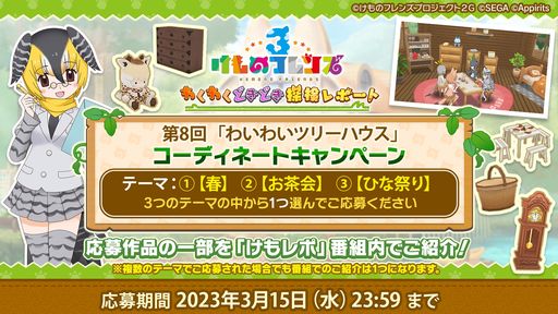 好評の番組コーナー企画として、生放送配信に先駆け『けものフレンズ3』公式Twitter(@kemono_friends3)で、「第8回 わいわいツリーハウスコーディネートキャンペーン」を実施いたします。