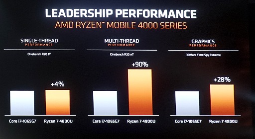 昨日はIntel側にIce Lake世代のCoreプロセッサに対して性能が劣ることを指摘されたわけだが,本日は,AMDが逆に「我々のほうが高性能である」といわんばかりに,Core i7-1065G7よりもRyzen 7 4800Uが高性能であることをアピールするベンチマークテスト実行結果のグラフを示す番となった。