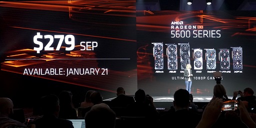 今回,壇上で紹介されたのはRadeon RX 5600 XTのみだったが,「XT」型番が外されたRadeon RX 5600も同時に発表となっている。こちらはCU数は32基と,さらにCU数が削減されたモデルだが,そのほかの仕様はXTモデルと同一である。