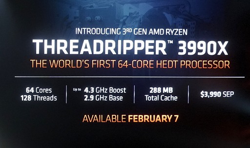 プレスカンファレンスの最後には,2019年末に予告されていたZen 2世代のRyzen Threadripperシリーズの最上位モデルで,64コア/128スレッドの処理能力を提供する「Ryzen Threadripper 3990X」が正式に発表となった。