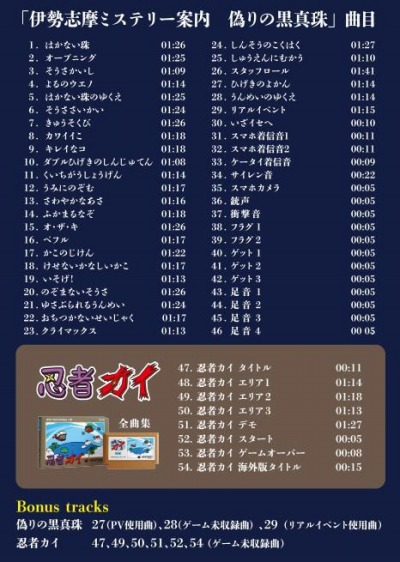 プロモーションビデオ使用BGM、リアルイベント使用BGM、未使用曲の3曲+ゲーム中でプレイできるミニゲーム「忍者カイ」の全曲(ゲーム使用曲3曲+未使用曲5曲)