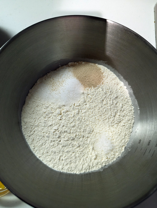 強力粉,ドライイースト,砂糖,塩をボウルに入れる。ドライイーストと砂糖は隣に置くと発酵しやすくなります