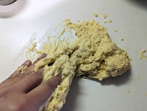 全体がしっかりと固まり艶が出るまで捏ねる。最初はベタベタですが,そのうちまとまるので頑張りましょう