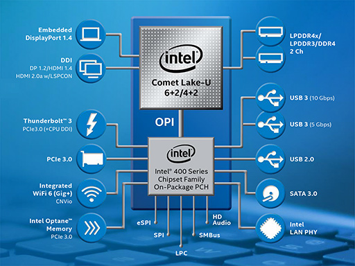 それでは,Comet Lakeの何が新しいのかと言うと,冒頭で触れたTDP 15WのCPUでは初の6コア12スレッド対応や,Wi-Fi 6ことIEEE 802.11axへの対応,Thunderbolt 3への対応といったあたりだ。加えて,Comet Lake-Uと組み合わせるチップセットとして,Wi-Fi 6やThunderbolt 3対応の新しい「Intel 400」シリーズが登場する。