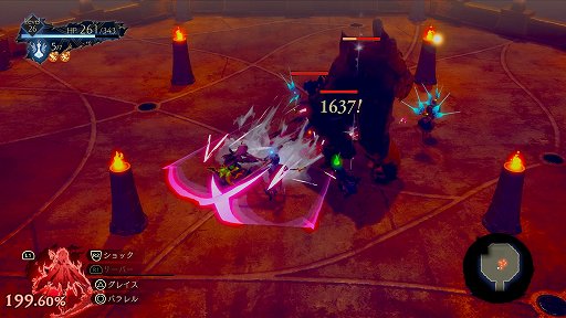 物語がダークであるのとは対照的に,本作のバトルは魔物達をなぎ払っていく気持ちのいいものとなっている。といっても,反射神経が必要なアクションではなく,立ち回りが重視される内容だ。ボス級の魔物ともなれば攻撃力が高く,相手の動きをしっかりと見て,一手先を行く感じで余裕を持って回避したい。