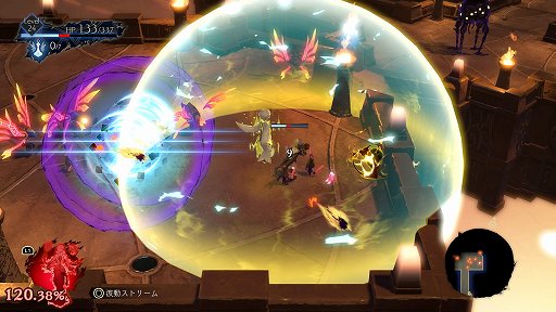 そして,特定の攻撃スキルを当てると発生する不思議な光球が装置だ。画面上に多く存在するほど,攻撃スキルの威力やクリティカル率がアップする。つまり,バリアの中に敵を誘い込み,スキルのクールタイムを把握した上で,できるだけ多くの装置を出すことを意識すれば,効率よく自身を強化できる。