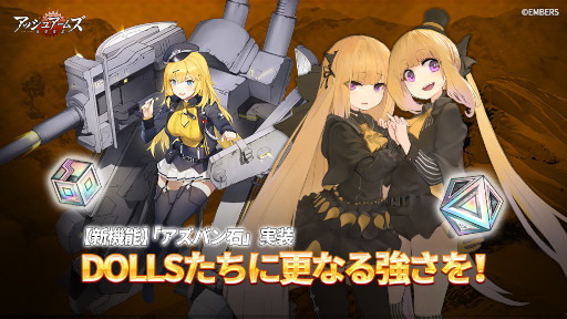 「アズバン石」とは新たな素材で開発されたDOLLSやARMSの強化システムです。「アズバン石」を搭載することで、ステータス向上、新スキル獲得などの強化でDOLLSの戦力を底上げすることができます。