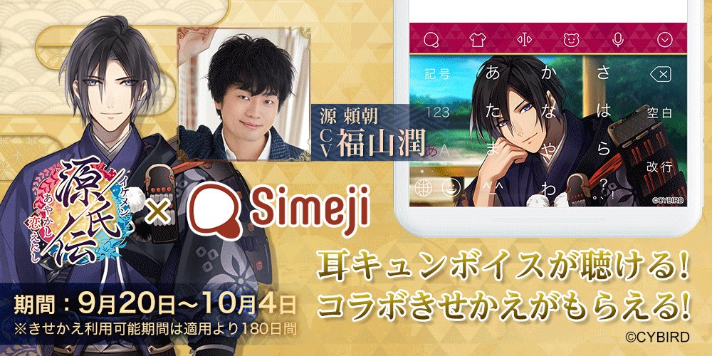 「イケメン源氏伝 あやかし恋えにし」が日本語入力アプリの「Simeji」とコラボ。 きせかえキーボードに源頼朝が登場